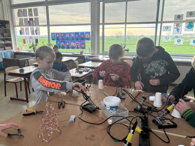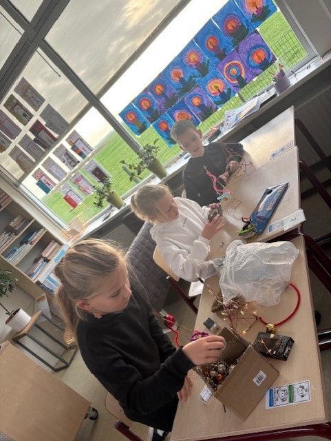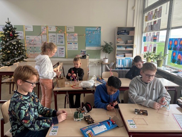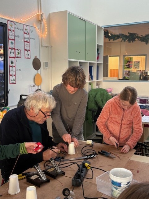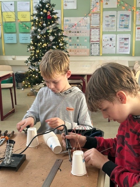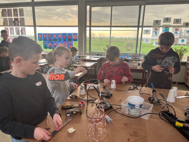 Op dinsdag 16 december had de bovenbouw wel heel veel geluk. Want buiten de heerlijke oliebol die we kregen, kwam er ook een meneer van het Techniekhuis lesgeven. Meneer Roos kwam met ons kerstboompjes van koperdraad maken. Dat betekende dat er een groepje koperdraad ging solderen en dat de anderen hier een boompje van maakten. Natuurlijk moesten deze boompjes versierd worden met echt werkende lichtjes, chenille draad en mooie kersthangertjes. Wat een leuk resultaat! Tijdens het kerstdiner zal het dus extra gezellig zijn in de klas met al die mooie boompjes. En daarna mogen ze thuis verder stralen! Het was een leuke en leerzame les.