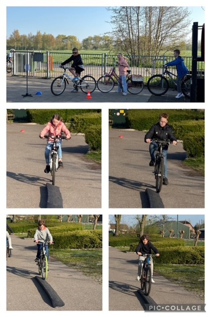 Alle leerlingen van de middenbouw hadden hun fiets nodig, want doormiddel van allerlei parcours en opdrachten werd de behendigheid geoefend. Denk hierbij aan fietsen over een smal pad, achteromkijken en afslaan, slalom fietsen en stoppen voor een stopbord. Ook stond er een stoplicht dat op ieder moment kon veranderen. De kinderen houden balans door één voet op de grond te zetten en te wachten op het stoplicht. Tijdens het fietsen kregen de kinderen ook te horen welke kant ze op moesten. Het was een leuke en leerzame les.